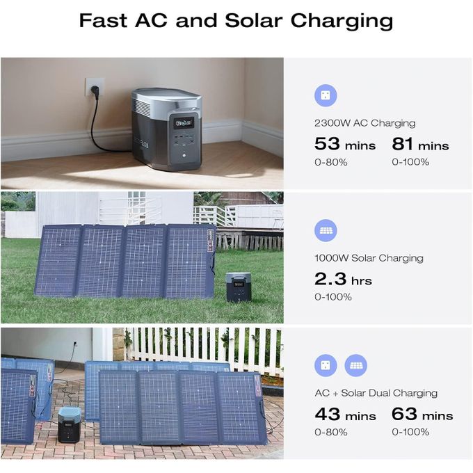 The ECOFLOW DELTA 2 Max 2048Wh delivers ultra-fast AC + solar charging, expandable capacity up to 6kWh, and a long-life LFP battery (3000 cycles)—quiet, clean, and powerful enough to run 99% of household devices.
